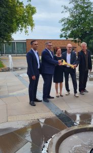 Symbolische Schlüsselübergabe bei sprudelnden Brunnen: Generalmusikdirektor Dirk Kaftan, Projektleiter Steffen Göbel, Oberbürgermeisterin Katja Dörner, Geschäftsführer der BonnCC Ralf Birkner und Leiter des Städtischen Gebäudemanagements Bonn Rachid Jaghou (v. r.)